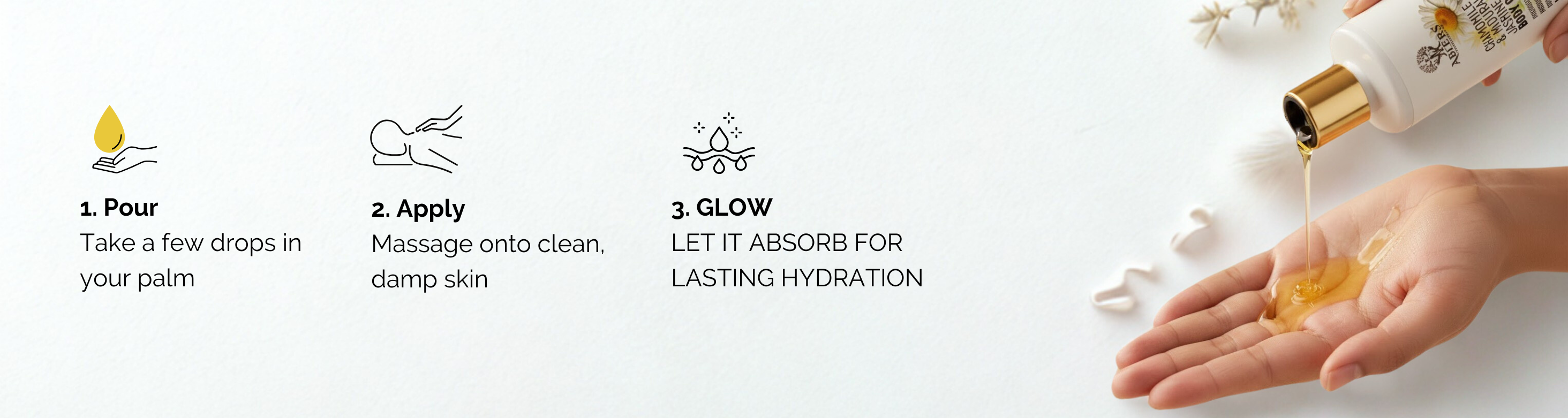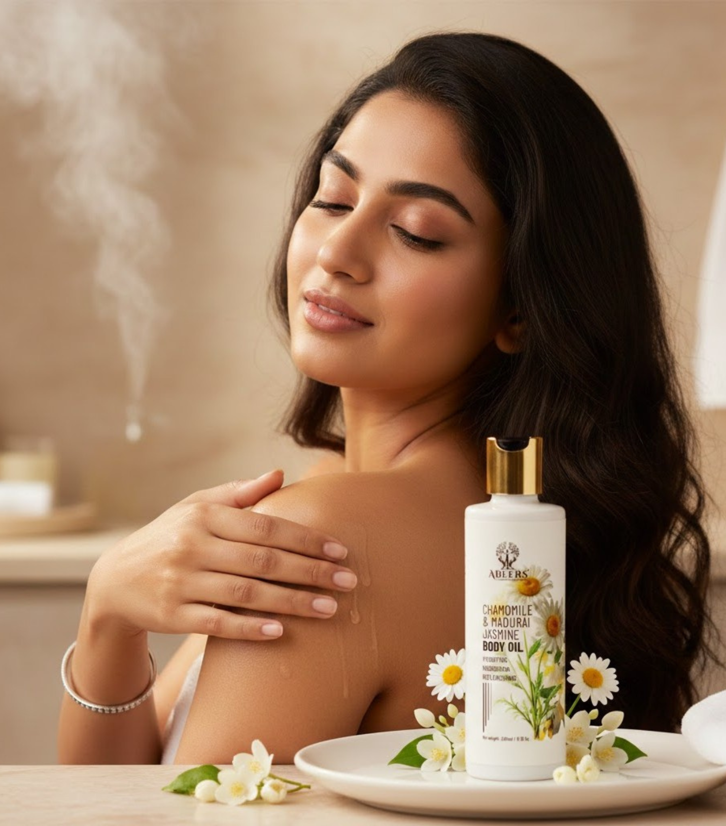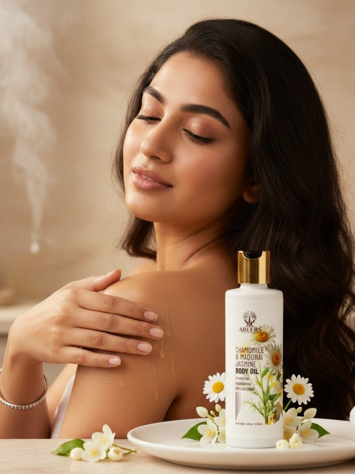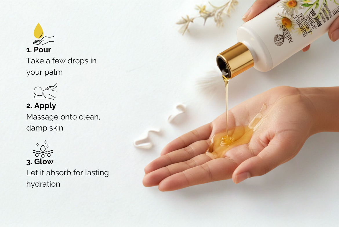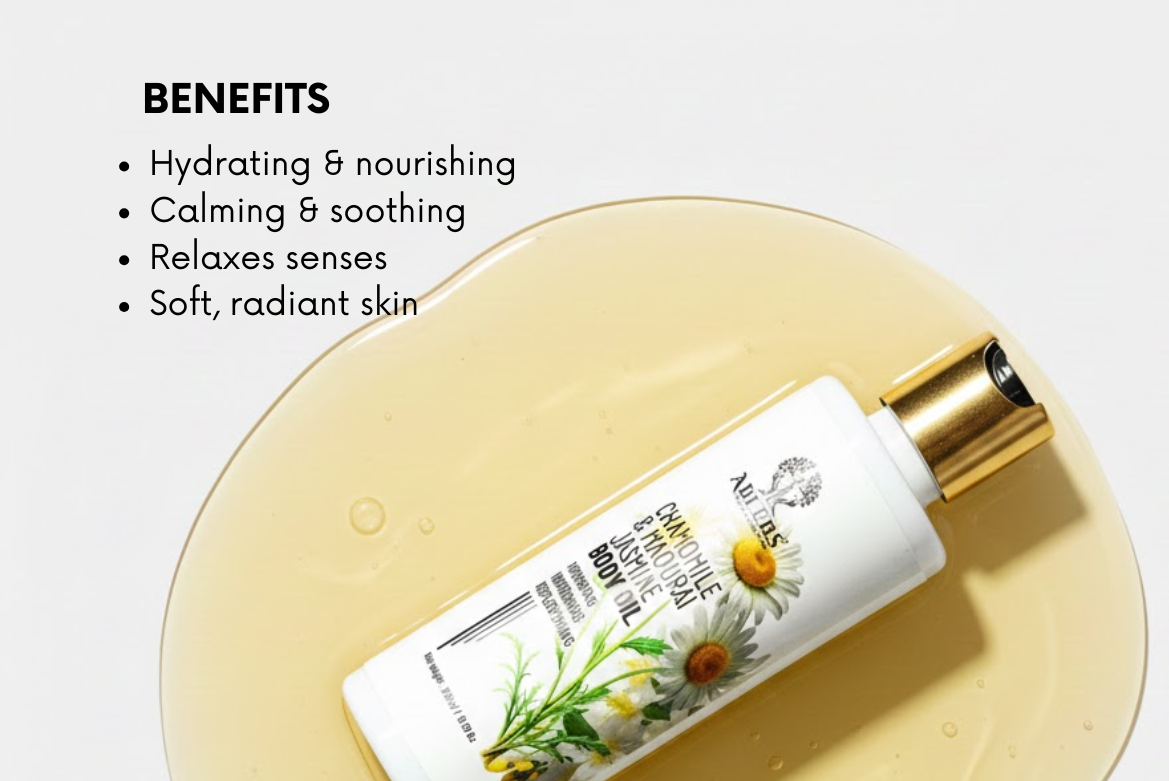 Chamomile & jasmine body oil for deep hydration, soft glow, and calming care.